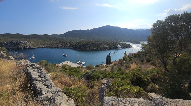 It feels like we have done alot and travelled some distance since we left Dan and Wilf in Poros. Once our hangovers and jobs were over we headed South via Ermioni once more, a quick stopover there and we crossed the Agrolic Gulf to Poulithra Bay. There is nothing there except a secure anchorage and a small church with a dock, we were lucky enough to see a wedding there with the bride arriving by boat just as we dropped our anchor. Listening to the service via loudspeaker whilst we had our post sail drink surely added to the ambiance. Next morning we headed south, changing our destination from Monemvasia to Gerakas, locally labelled 'The Greek Fjord'. That a bit of a stretch but it was a lovely place. We explored the lagoon at the end of the inlet which turned out to be extremely shallow and no place for an outboard engine! We also had a walk up to the castle ruins before grabbing and ice cream to cool down. Ant and Ros joined us, having dropped their own guests off at Poros and sailed down via Milos. Great to see them again and have drinks onboard their boat.