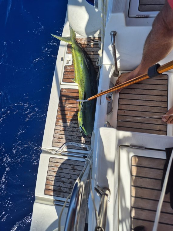 There was no wind forecast for the next day so we had a lazy start, but the wind gradually built to a decent breeze and we had a smooth sail towards Koroni. Just as Nigel was writing this, under sail at 5knts upwind, the fishing reel went off. We have jet to catch a fish on board and this was a new event for us. As we have to to stop the boat, Nigel grabbed the rod only to see a massive Mahi Mahi on the line. An exhausting battle ensued, with Nigel only being able to wind in half a turn at a time until the fish got tired. After one last run and jump out of the water it gave up and we reeled him in. Once onboard we could see he was a huge specimen around 1.3m long, weight unknown, but it was extremely hard to lift him up. Not bad for a first ever catch! Malcolm from Grace of Sydney helped us fillet it and despite giving then several portions and taking some ashore to a taverna to be cooked for all of us, our fridge and freezer are full. Fish for lunch and tea every day for the next month then!
