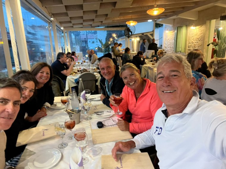 Andy Provan had left the boat but was still in Corfu, now with his wife Louise. We took them back on board for a daysail and all had a great meal in a taverna afterwards, despite the horrendous rain. It was a fun social event to have all onboard at the same time though.