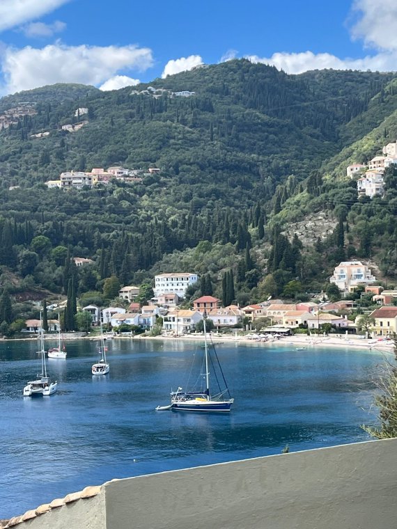 We welcomed Paul and Tracy onboard in Corfu, they are friends from home in Whitstable and are also WYC members. It was great to spend time with them but sadly the weather didn't really play ball, being a bit chilly and occasionally wet. We did find a decent anchorage in Kalami bay, going ashore to a restaurant called the White House. Imagine our surprise to discover it was THE White House once belonging to Lawrence Durrell of the infamous Durrell family. His brother Gerald wrote My Family and Other Animals which we both should now read! The interior was all designed around memorabilia focussed on the family. The food and wine were gorgeous.